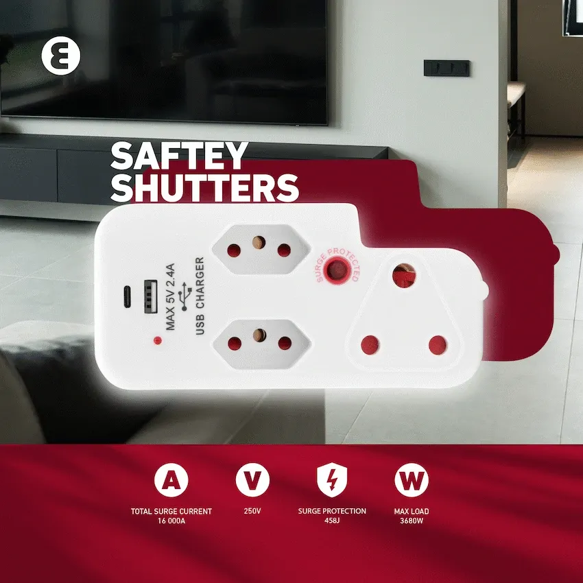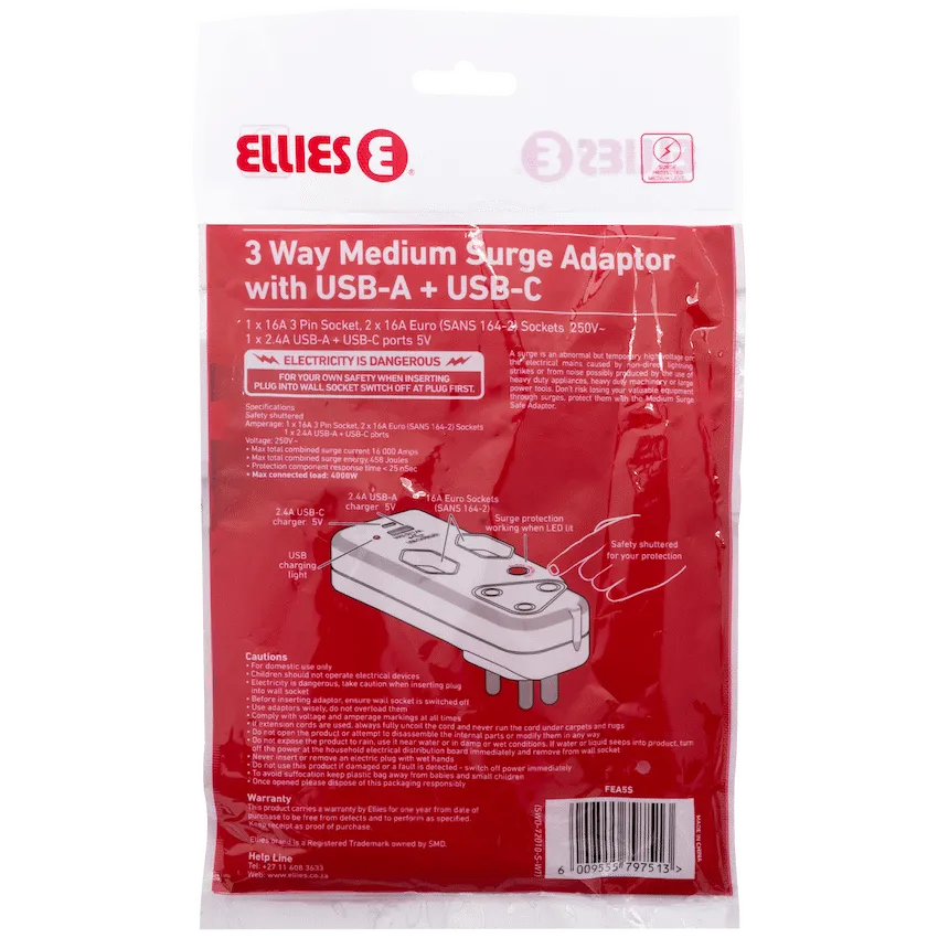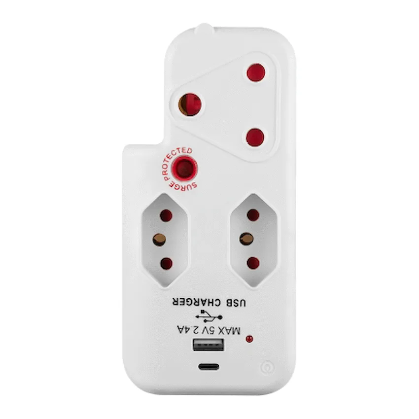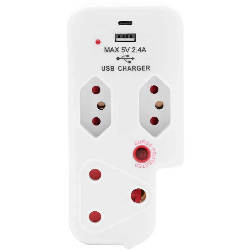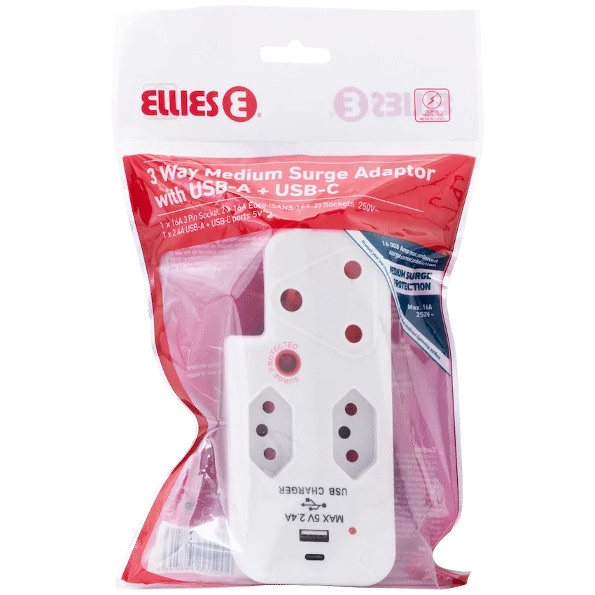Ellies 3 Way Medium Surge Adaptor with Type C + USB - White
